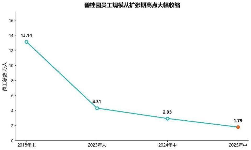 碧桂园此前是拥有员工超过13万人的超级房企。2018年年末员工总数为131387人,在2019年房地产行业遇冷后,截至2020年末,碧桂园员工总数降为93899人,两年时间碧桂园员工人数骤减近三成。2021年,碧桂园员工人数短暂反弹,员工总数同比增长7.2%,总人数再次超过10万,达100700人。但随后三年每年同比分别减少57.2%、47.1%和21.4%,员工总数降至2025年中期的17920人。相比2018年,员工减少了113467人,员工总体降幅高达86%。