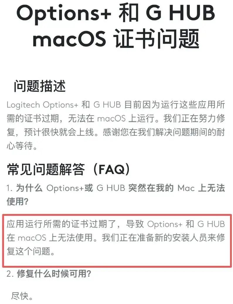 原因很简单——罗技在苹果系统上的应用证书过期,忘续签了。