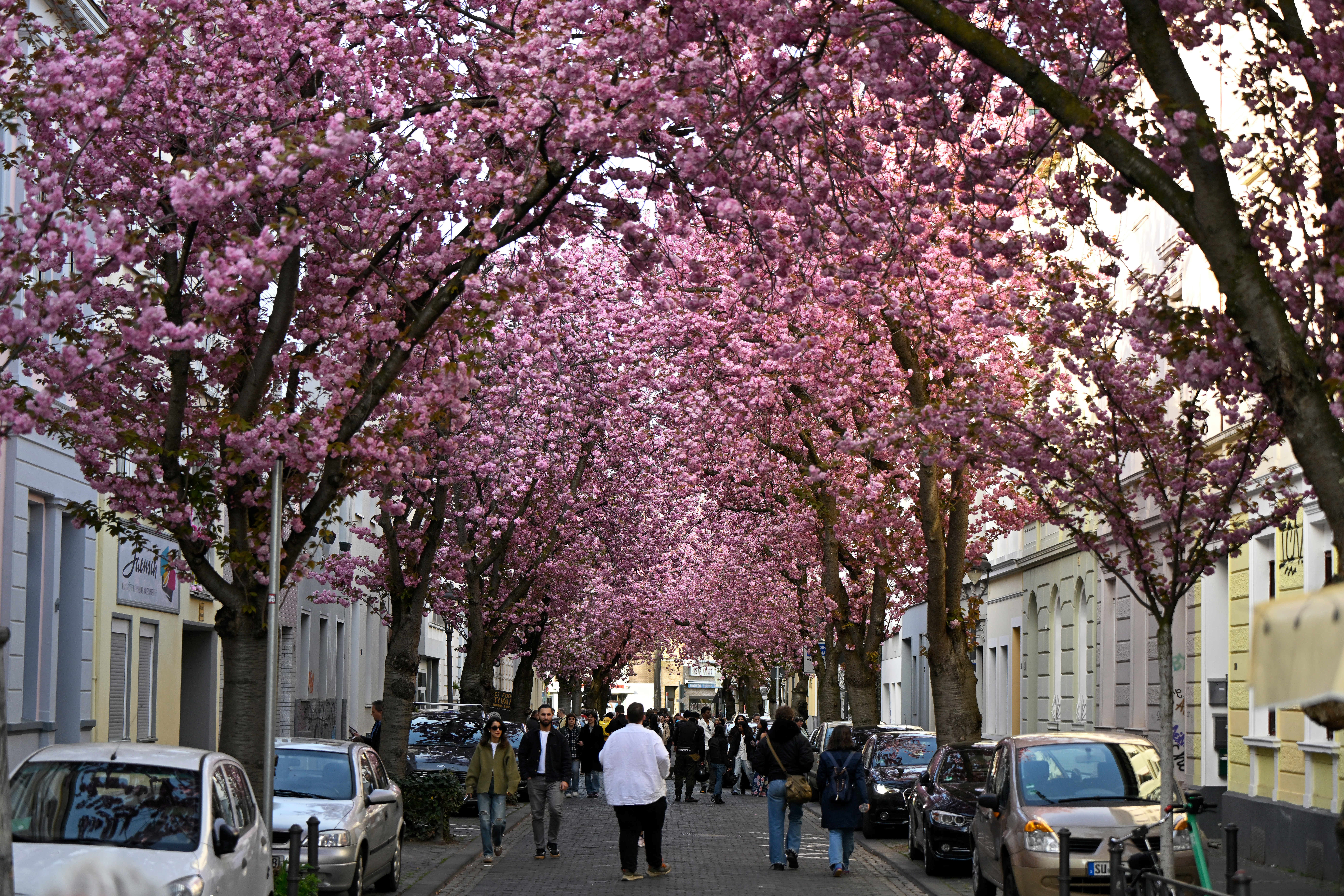 4月6日,在德国波恩,人们走在樱花树下。新华社发(乌尔里希·胡夫纳格尔摄)