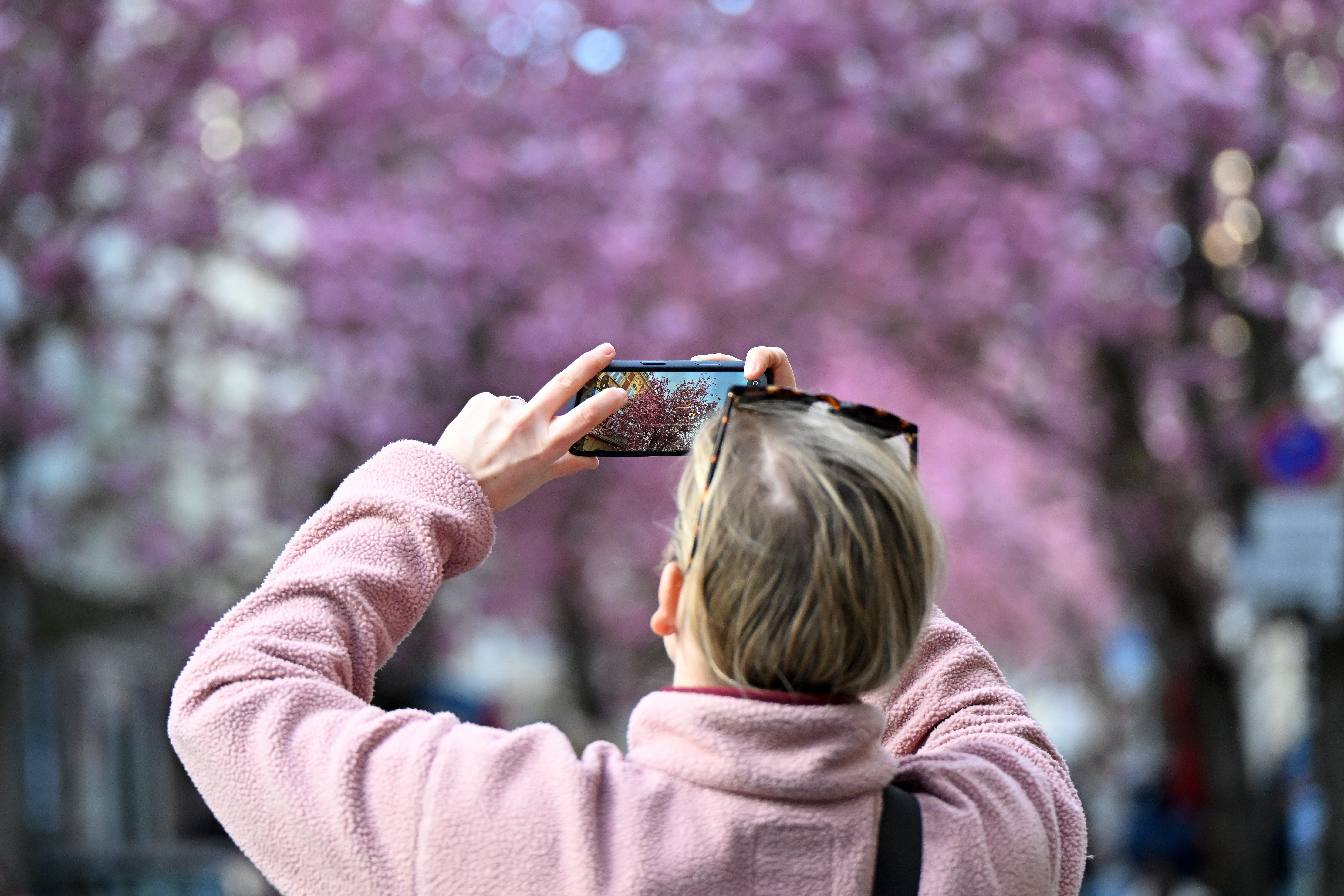 4月6日,一名游客在德国波恩拍摄樱花。新华社发(乌尔里希·胡夫纳格尔摄)