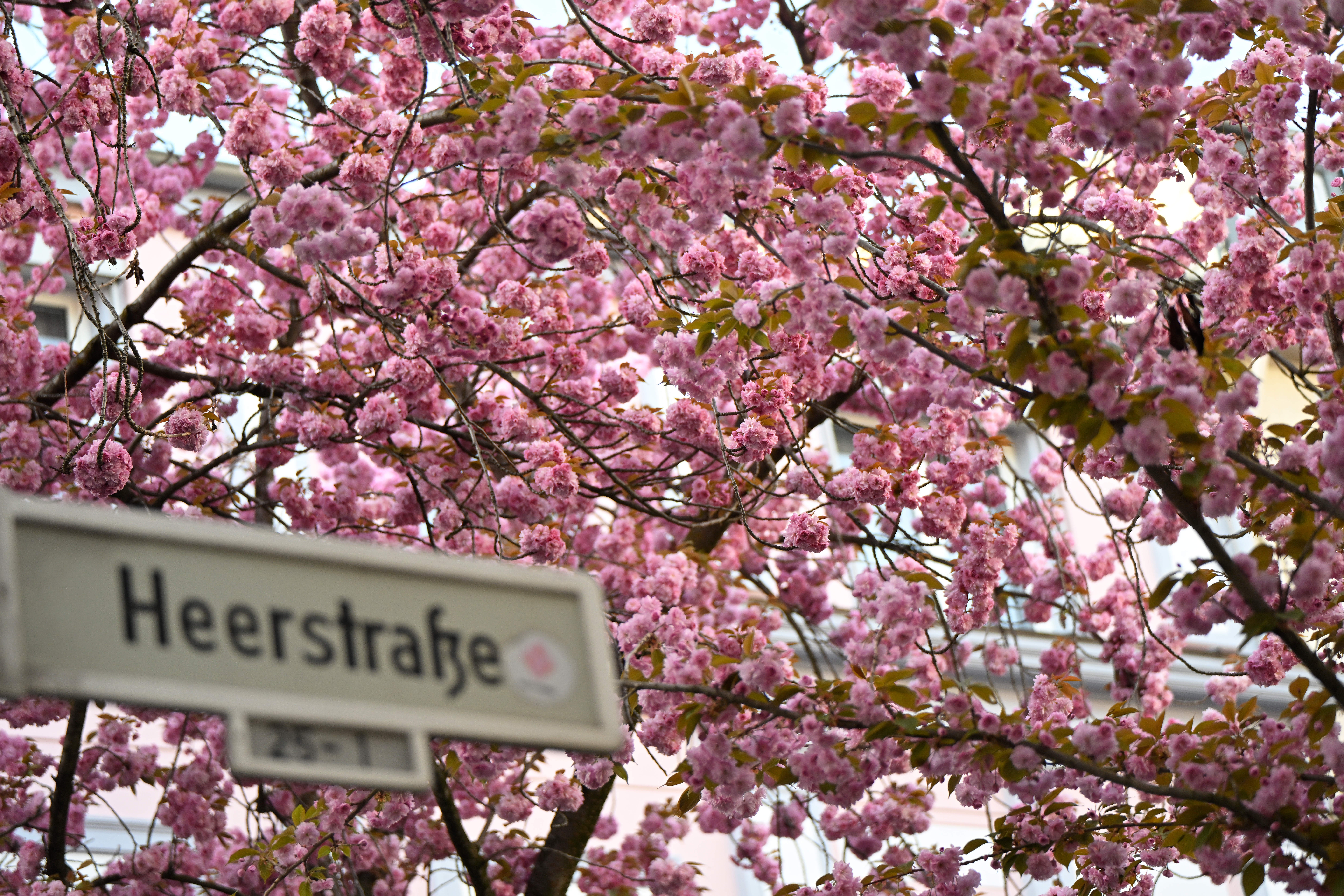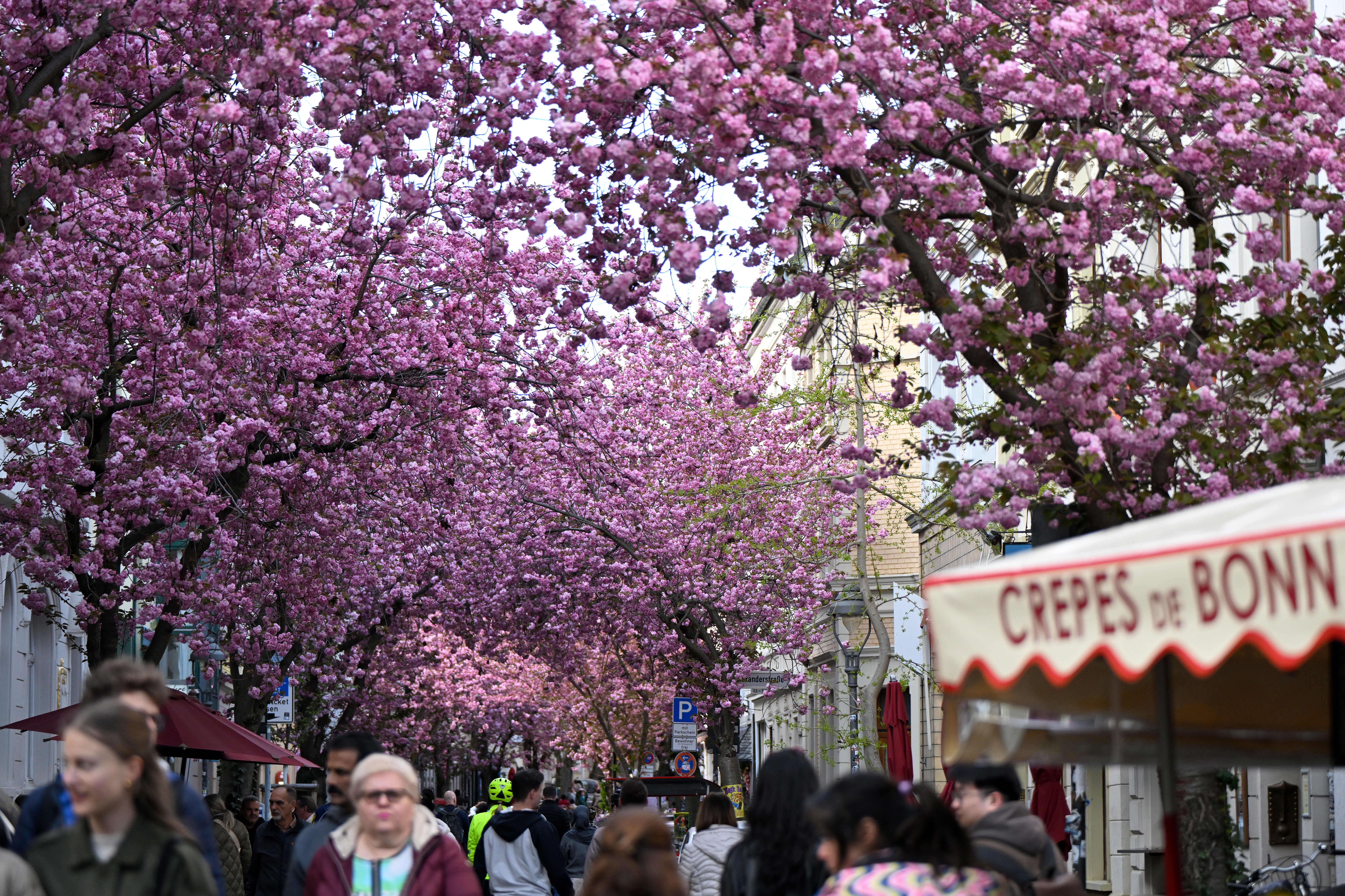 近日,德国西部城市波恩老城区樱花盛开,吸引了许多游人前来观赏。
